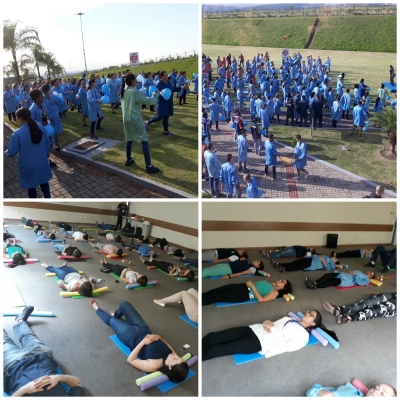 Durante a ação, para iniciar as atividades do dia cheios de energia e disposição, no gramado da empresa, os professores ministravam um “aulão” de Ginástica Laboral, levando aos presentes uma aula dinâmica e revigorante.